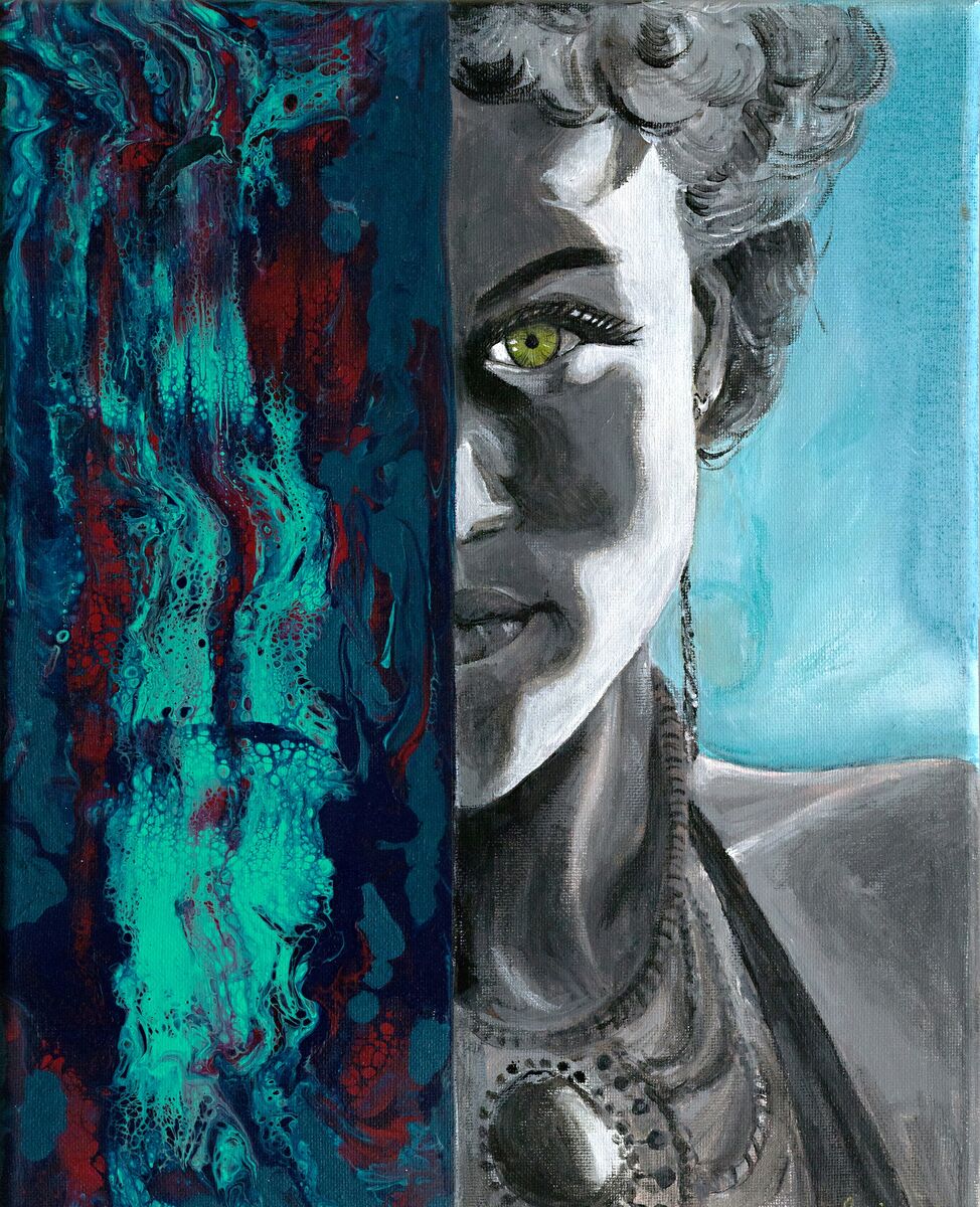 this is the portrait of a mixed race Trinidadian woman who gre up in London. The painting reflects the tide rising and falling of the ocean, how it floats us from one place to the next.